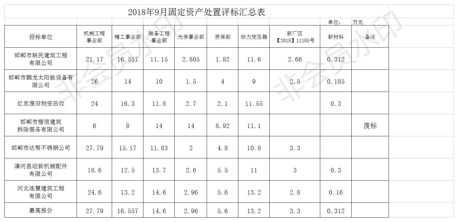 汉光重工西厂区废旧物资(设备类)公开招标结果公示